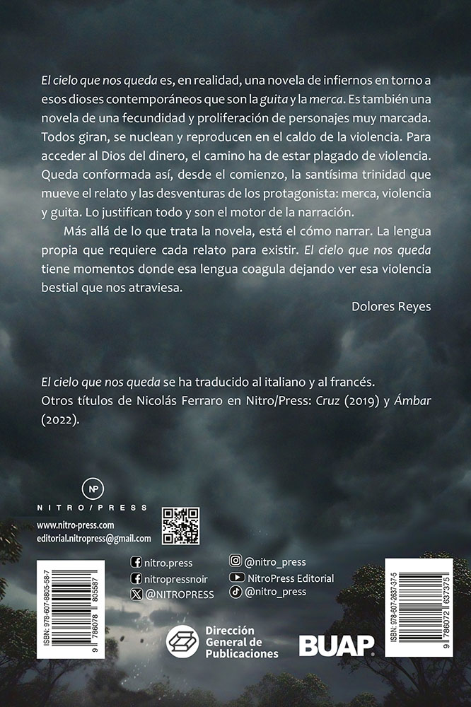 El cielo que nos queda es, en realidad, una novela de infiernos en torno a esos dioses contemporáneos que son la guita y la merca. Es también una novela de una fecundidad y proliferación de personajes muy marcada. Todos giran, se nuclean y reproducen en el caldo de la violencia. Para acceder al Dios del dinero, el camino ha de estar plagado de violencia. Queda conformada así, desde el comienzo, la santísima trinidad que mueve el relato y las desventuras de los protagonista: merca, violencia y guita. Lo justifican todo y son el motor de la narración. Más allá de lo que trata la novela, está el cómo narrar. La lengua propia que requiere cada relato para existir. El cielo que nos queda tiene momentos donde esa lengua coagula dejando ver esa violencia bestial que nos atraviesa. Dolores Reyes El cielo que nos queda se ha traducido al italiano y al francés.