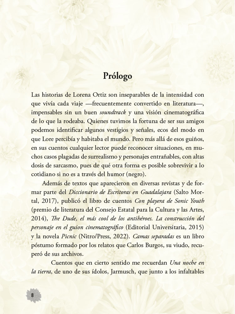 Lorena Ortiz fue una hermosa rara avis de la literatura mexicana. En el prólogo de este libro, Fanny Enrigue escribe: «Las historias de Lorena Ortiz son inseparables de la intensidad con que vivía cada viaje». Y es cierto. Al igual que en su novela Picnic (Nitro/Press, 2022), los personajes de Camas separadas viven una especie de cosmopolitismo mundano. Su inquietud los lleva a cualquier parte del mundo, desde Ajijic hasta Le Cap Ferret, para hospedarse en hostales o trabajar en bares, hoteles y restaurantes. Salen de noche a caminar en busca de una cerveza, un toque, una charla sobre cine o música. No se dejan atrapar por eso que llamamos mundo. Artista en varias disciplinas, Lorena Ortiz nos vuelve a sorprender con su manejo del diálogo, virtud perfeccionada en el guionismo. Pero a diferencia de su novela, los cuentos de Camas separadas no tienen ningún interés por contarnos algo con un inicio para dirigirse a un fin. Aquí parece darse rienda suelta la Lorena fotógrafa. Porque lo importante son las situaciones. No lo que leímos, una vez que terminamos cada pieza, sino aquello que sucede mientras leemos. Es decir: lo que sucede dentro de cada historia y lo que nos sucede a nosotros mientras la leemos. Nitro/Press se complace en ser la casa editorial de Lorena Ortiz, primero con Picnic, y ahora, de manera póstuma, con Camas separadas, gracias al esfuerzo de Carlos Burgos, su pareja de toda la vida.