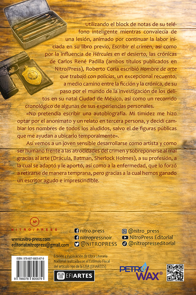 Utilizando el block de notas de su teléfono inteligente mientras convalecía de una lesión, animado por continuar la labor iniciada en su libro previo, Escribir el crimen, así como por la influencia de Hércules en el desierto, las crónicas de Carlos René Padilla (ambos títulos publicados en Nitro/Press), Roberto Coria escribió Hombre de arte que trabajó con policías, un excepcional recuento, a medio camino entre la ficción y la crónica, de su paso por el mundo de la investigación de los delitos en su natal Ciudad de México, así como un recorrido cronológico de algunas de sus experiencias personales. «No pretendía escribir una autobiografía. Mi timidez me hizo optar por el anonimato y un relato en tercera persona, y decidí cambiar los nombres de todos los aludidos, salvo el de figuras públicas que me ayudan a ubicarlo temporalmente». Así vemos a un joven sensible desarrollarse como artista y como ser humano frente a las atrocidades del crimen y sobreponerse al mal gracias al arte (Drácula, Batman, Sherlock Holmes), a su profesión, a la cual se adaptó y le aportó, así como a la enfermedad, que lo forzó a retirarse de manera temprana, pero gracias a la cual hemos ganado un escritor agudo e imprescindible.