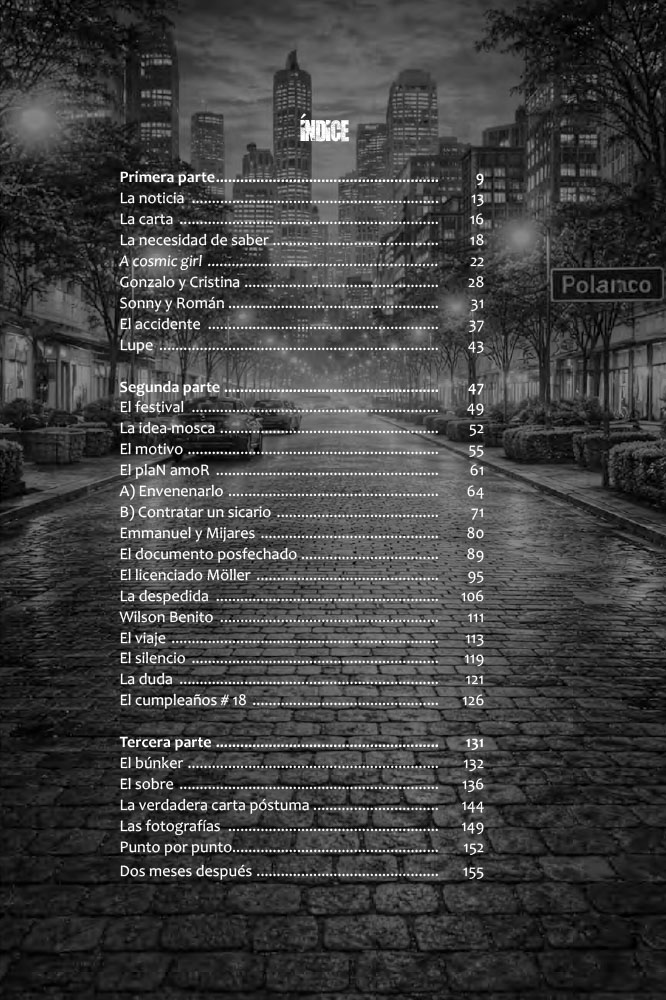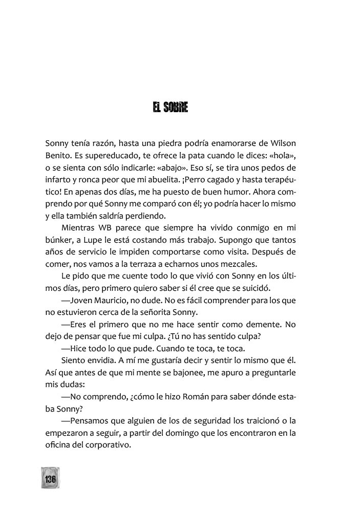 La joven modelo Sonny de la Riva es hallada en su departamento de Polanco, dos días después de cumplir dieciocho años, con un tiro en la sien derecha y una carta de despedida. Pero Mauricio Bonfil Carrera, su mejor amigo, sabe que Sonny era zurda y que jamás habría redactado una carta tan cursi y correcta, así que decide indagar por su cuenta, solo para verse en un rompecabezas cuyas partes, cuando parecen a punto de embonar, vuelven a desacomodarse. Empujado por su propia tragedia y por su fraternidad con Sonny, sale de cada encrucijada hasta llegar al fondo del caso, no siempre ileso.